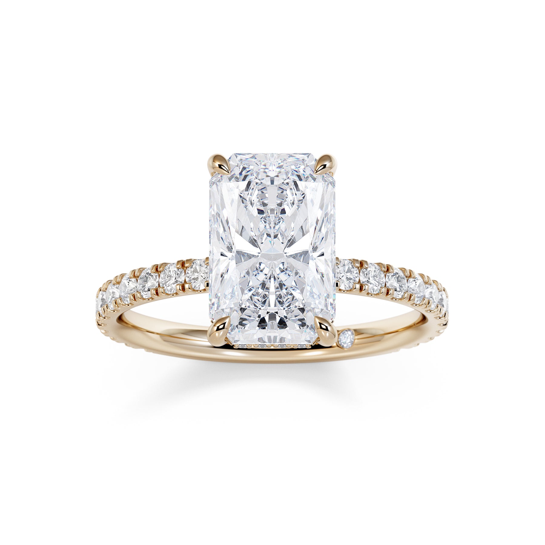 The radiant cut diamond, a pairing of clean lines with fiery brilliance, is held in a softly curving four-claw setting. Elevated with a hidden halo and a diamond-set band, these luxurious details infuse the ring with modern sparkle while allowing the radiant’s incredible facets to take centre stage…
